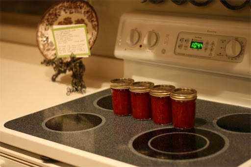 ...four bottles of homemade strawberry freezer jam.  Most things in my life are not homemade.  I love our modern conveniences, but there is something in me that has a nostalgia about a time that I never lived in.  When I make jam or banana bread or baking powder biscuits I feel a connection to the homemakers of days gone by.  I even bought a cute apron from anthropologieapron to tie around my waist when I am feeling especially June Cleaver-ish.  Unfortunately, the apron doesn't always work...pasta still comes from a box and the cream soups still come from a can.  BUT, Shelby will have fabulous jam to go with her peanut butter sandwiches made from my own two hands.  Go June!